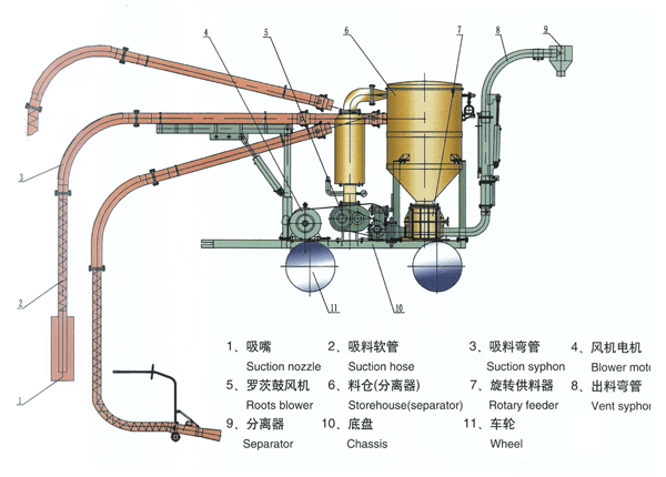 移动式气力输送系统 风机进口产生一定负压力的气体,物料从吸嘴吸入,运送到分离器,物料在重力作用下进入卸料器,在电机带动下均匀供料。风机出口产生一定压力的高压气体,携带物料运送到指定位置。