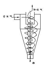工作原理:旋风除尘器的工作原理如下图所示,含尘气体从入口导入除尘器的外壳和排气管之间,形成旋转向下的外旋流。悬浮于外旋流的粉尘在离心力的作用下移向器壁,并随外旋流转到除尘器下部,由排尘孔排出。净化后的气体形成上升的内旋流并经过排气管排出。