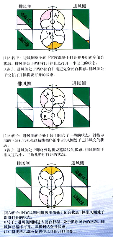 旧的罗茨风机,无论两叶型、三叶型,其压缩原理是:转子顶端向排风口一线打开的瞬间,排风口高压空气逆流于机壳之内,进行压缩。这种逆流与压缩产生剧烈的压力变化。这种压力变化形成了风机的噪音原因。本风机为消除这种因素而研究了螺旋形状,下面就本风机螺旋开关的要点进行说明。