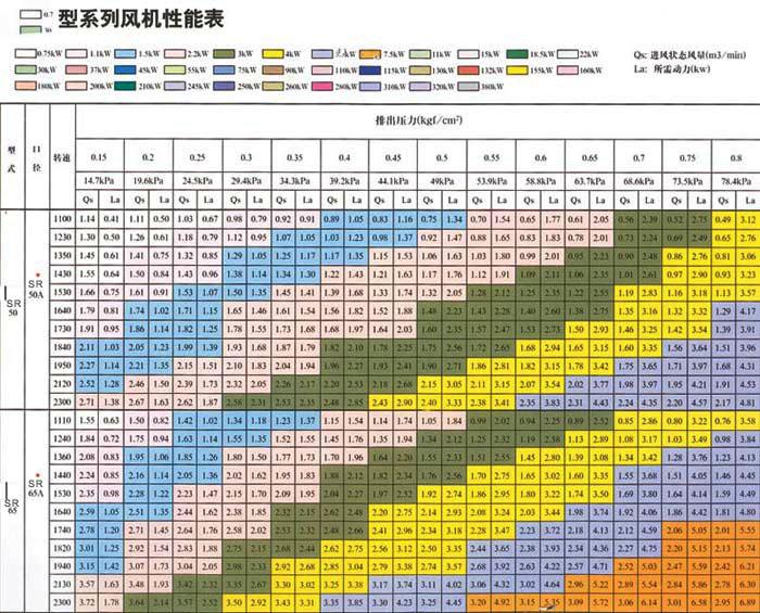 每种型号都有性能表和标准规格,易于选择风机型号。
